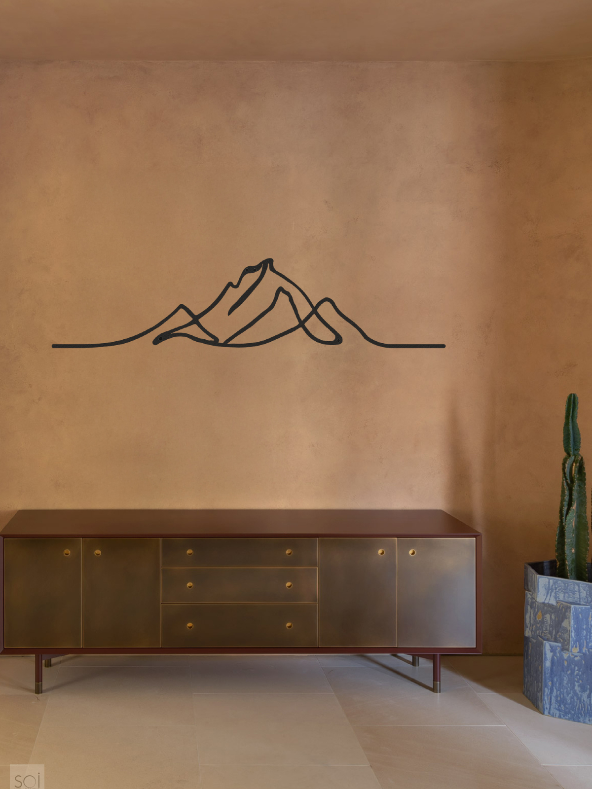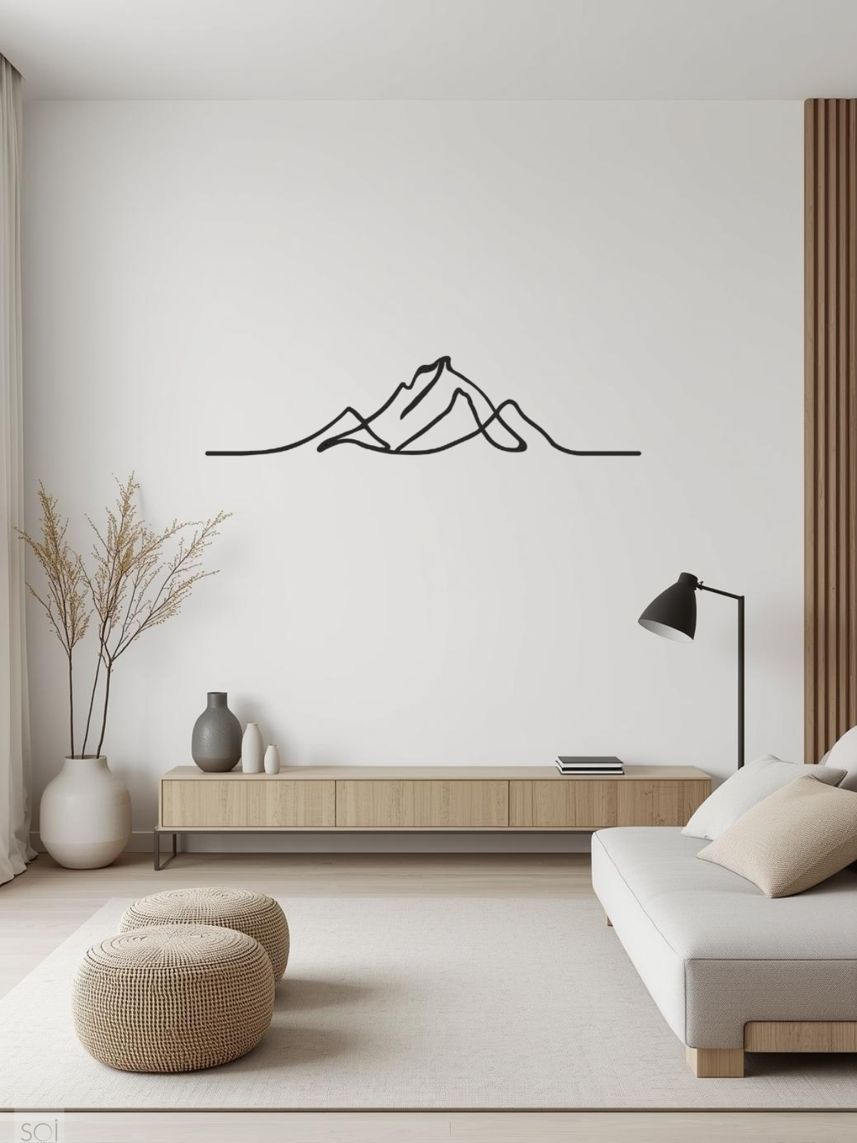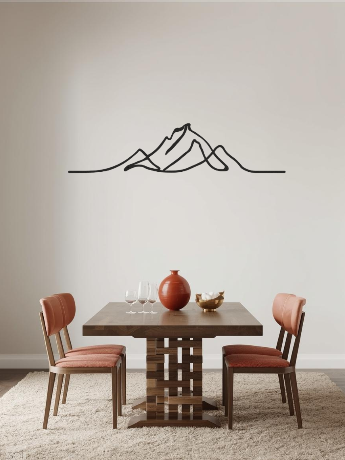 Minimal çizgileriyle Montara dağ silüeti metal duvar tablosu, geniş duvarlarda zarif ve dengeli bir görünüm oluşturur.